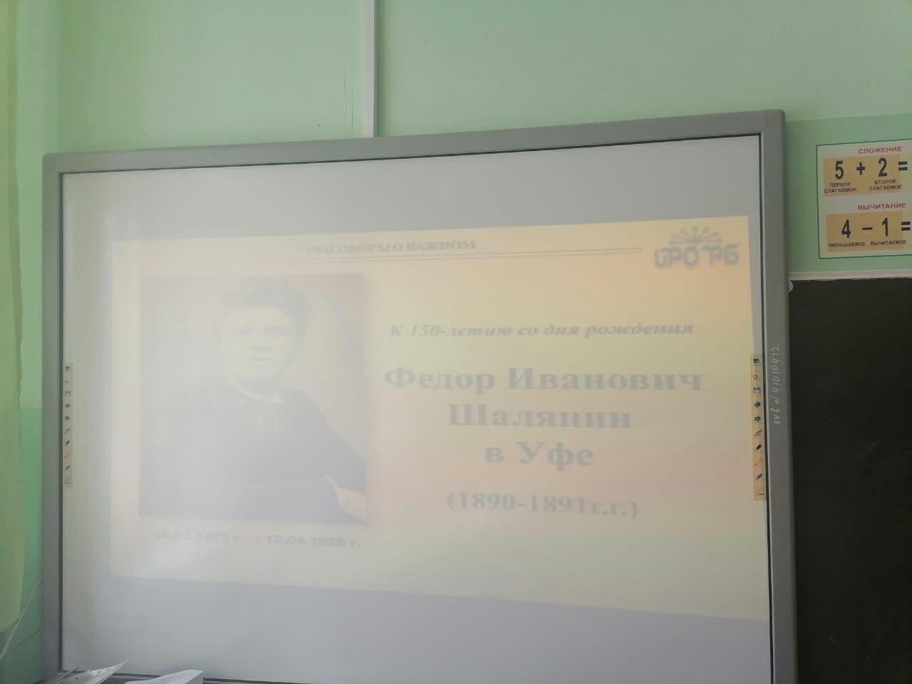 К 150-летию со дня рождения Федора Ивановича Шаляпина - русского оперного и камерного певца, который в разное время был солистом Большого и Мариинского театров, а также театра Метрополитен Опера. Свой творческий путь Федор Иванович Шаляпин начинал в нашей столице – городе Уфа. Именно здесь Ф.И.Шаляпин получил первые уроки театрального мастерства. Он начинал незаметным хористом, с увлечением помогал рабочим сцены, получая огромное удовольствие от своей работы. Увековечена память о Шаляпине в Уфе – на здании Уфимской государственной академии искусств (бывшего Дворянского собрания) - 6 февраля 1967 года была открыта мемориальная доска с надписью на русском и башкирском языках: «В этом здании в 1891 году выступал великий русский артист и певец Федор Иванович Шаляпин». 14 февраля в МАОУ СОШ №7 прошли мероприятия в честь дня рождения выдающегося и талантливого певца. В классах были проведены беседы и презентации, на которых учащиеся узнали больше о творчестве и биографии Ф.И.Шаляпина, прослушали его работы.