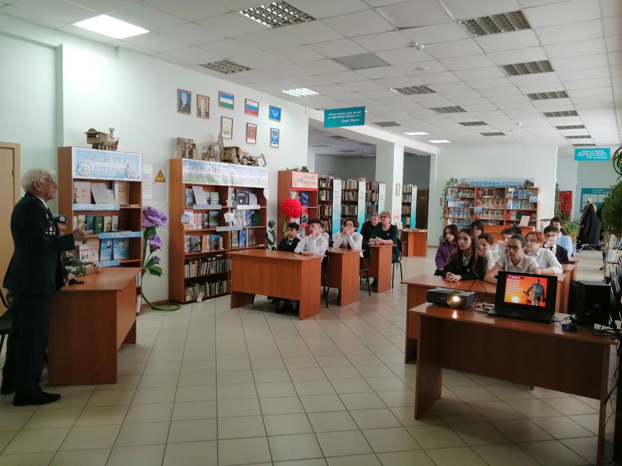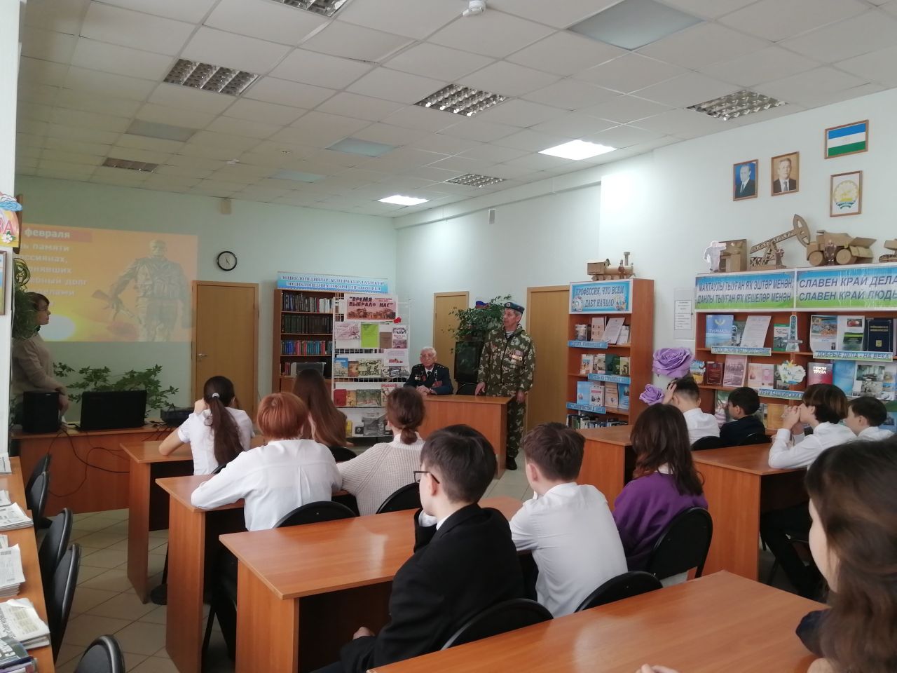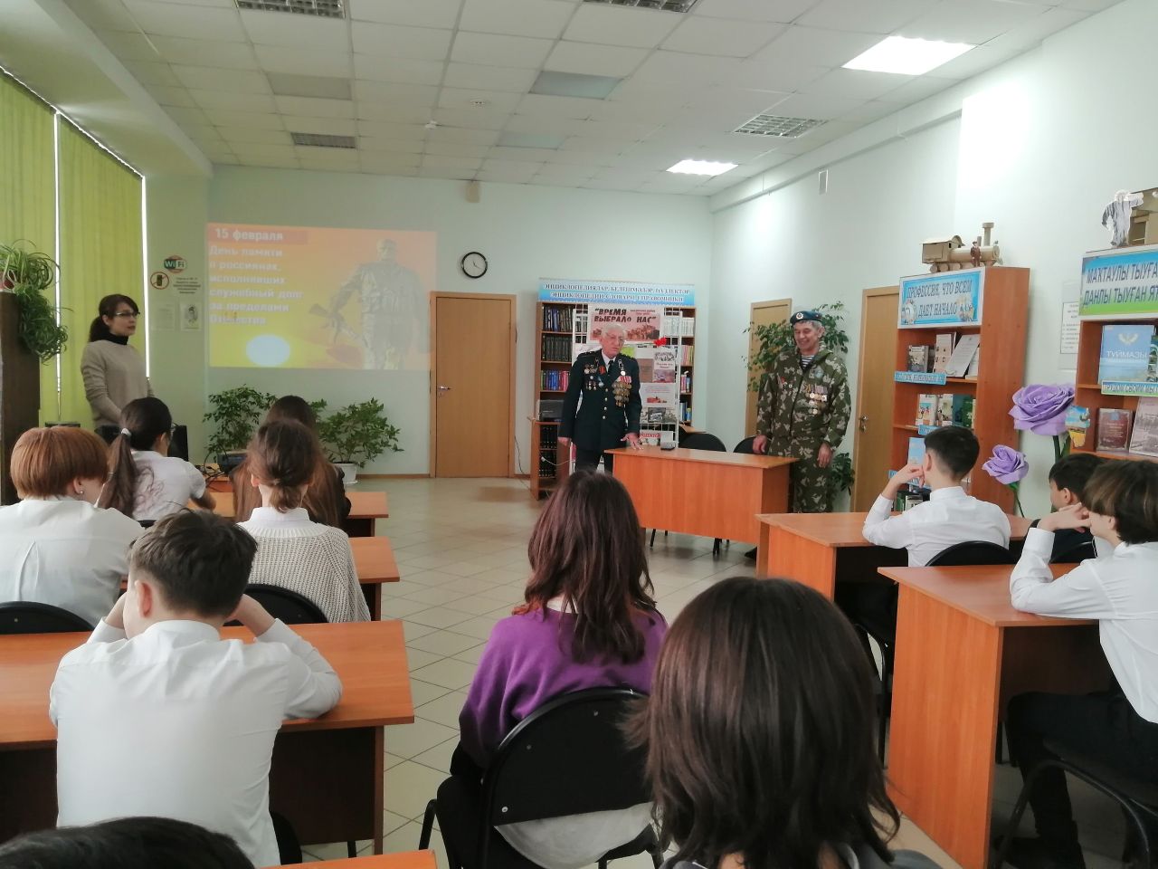 14 февраля в городской модельной библиотеке №4 накануне Дня памяти о россиянах, исполнявших служебный долг за пределами Отечества, прошла встреча «России верные сыны». На встречу с учащимися 7 «Г» класса СОШ №7 пришли Василий Степанович Биккинин, ветеран афганской войны, руководитель Туймазинской организации ветеранов боевых действий «Серпантин» и Ильяс Гусманович Гилязов, воин-интернационалист, выполнявший служебный долг в Анголе. Василий Степанович объяснил школьникам, почему на разных континентах земного шара происходят вооружённые конфликты, и почему в эти события, вовлекались советские и российские солдаты. Ветеран афганской войны также поделился своими воспоминаниями, рассказал интересные, в то же время нравственные истории, которые случились с ним в Афганистане. Ильяс Гилязов рассказал ребятам, какую задачу выполняли советские солдаты в Анголе в 1970-е г. В завершении встречи гости пожелали учащимся хорошо учиться, уважать учителей и родителей, любить и гордиться своей страной.
