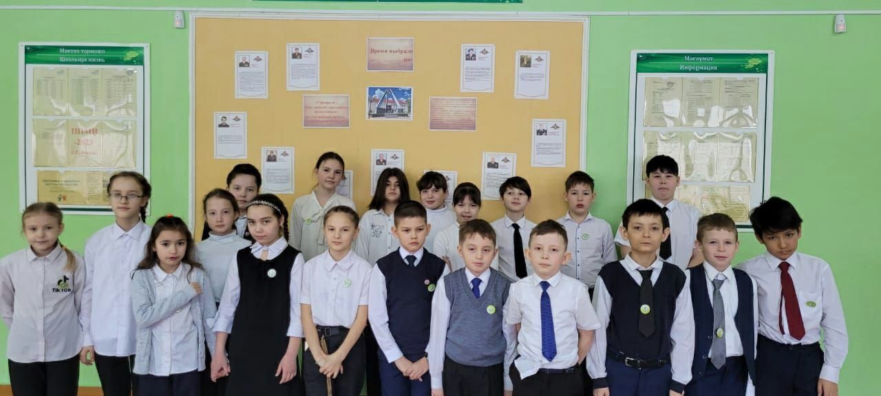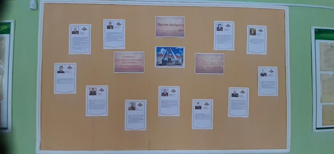 Советником директора по воспитанию совместно с активов школы в фойе школы оформлен информационный стенд «Время выбрало нас», где учащиеся могли ознакомиться с биографиями и подвигами россиян, исполнявших служебный долг за пределами Отечества, классные руководители провели беседы. Учащиеся школы приняли участие в онлайн-фотомарафоне "Герои войны среди нас".