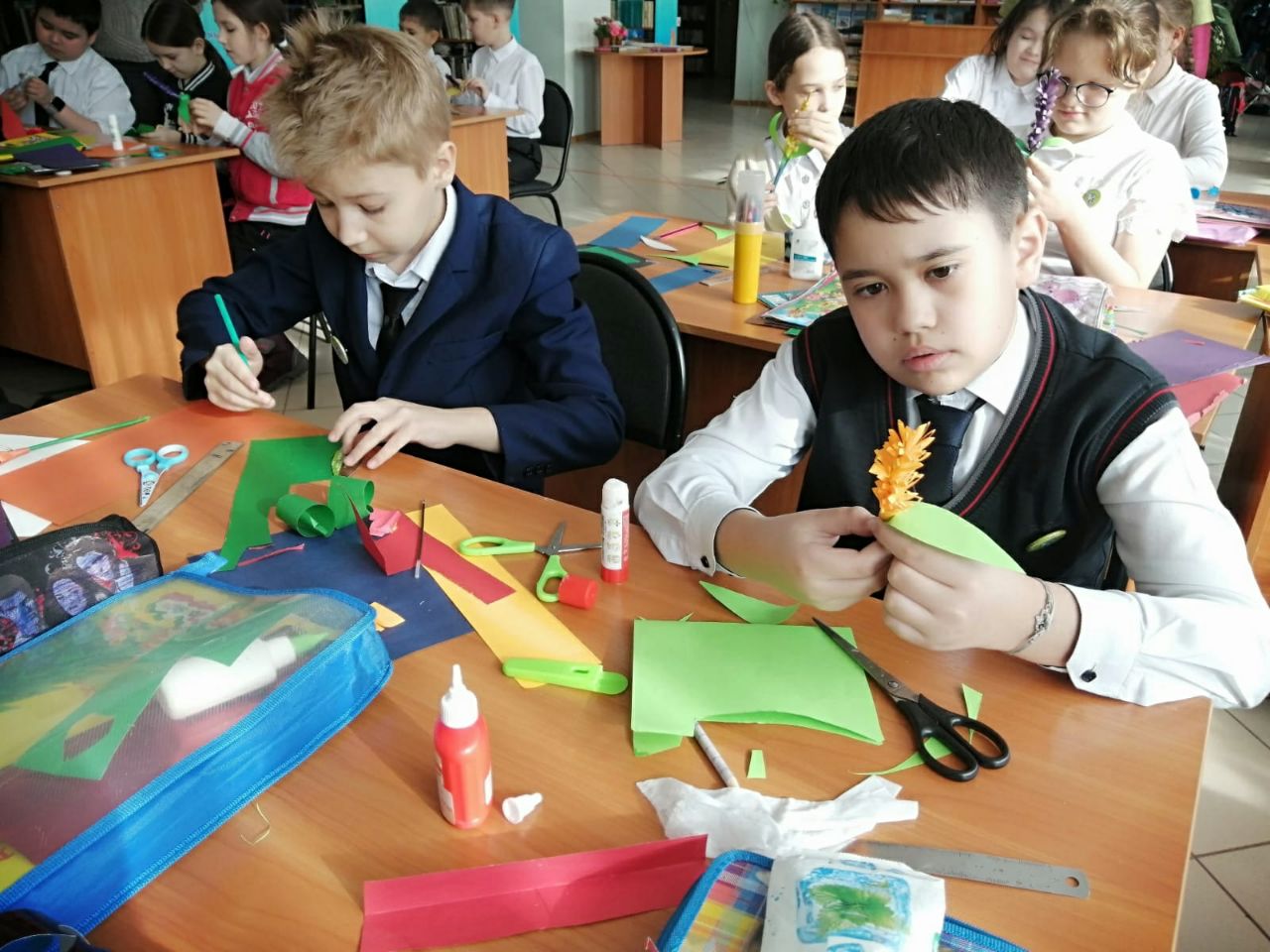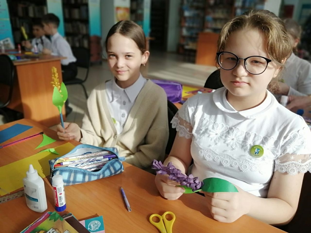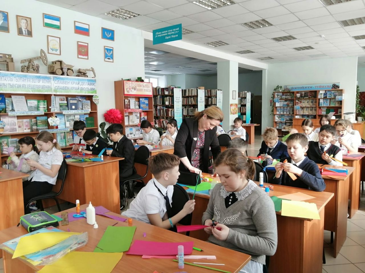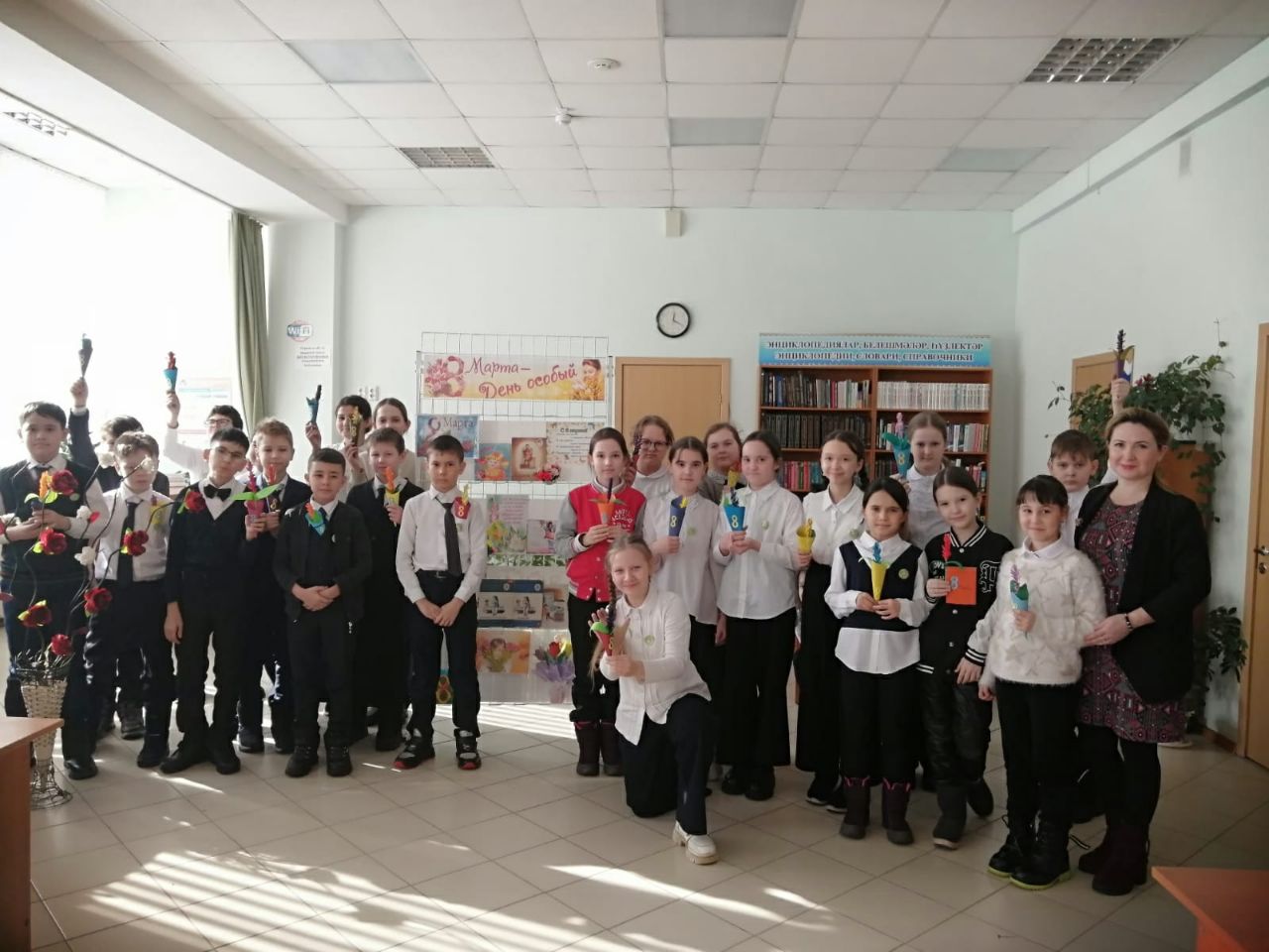 В преддверии Международного женского дня, 3 марта, в нашей библиотеке для учащихся 4 «В» класса СОШ №7 состоялась творческая мастерская «Букет цветов для мамы». Перед началом мастер-класса библиотекарь рассказала ребятам о празднике, его истории и традициях празднования. Много замечательных и добрых слов было сказано детьми в адрес своих любимых мам, бабушек и сестёр. Затем в качестве подарка было предложено изготовить красивый букетик. С большим интересом ребята приступили к творческому процессу. При помощи стержня из цветной бумаги учащиеся изготовили стебель. Потом из прямоугольной заготовки сделали своеобразную розетку цветка и накрутили её на стебель. С помощью шаблонов вырезали длинные и узкие с закруглённым кончиком листья. Готовый цветок оформили в букет. К мероприятию была оформлена книжная выставка «8 марта - День особый».