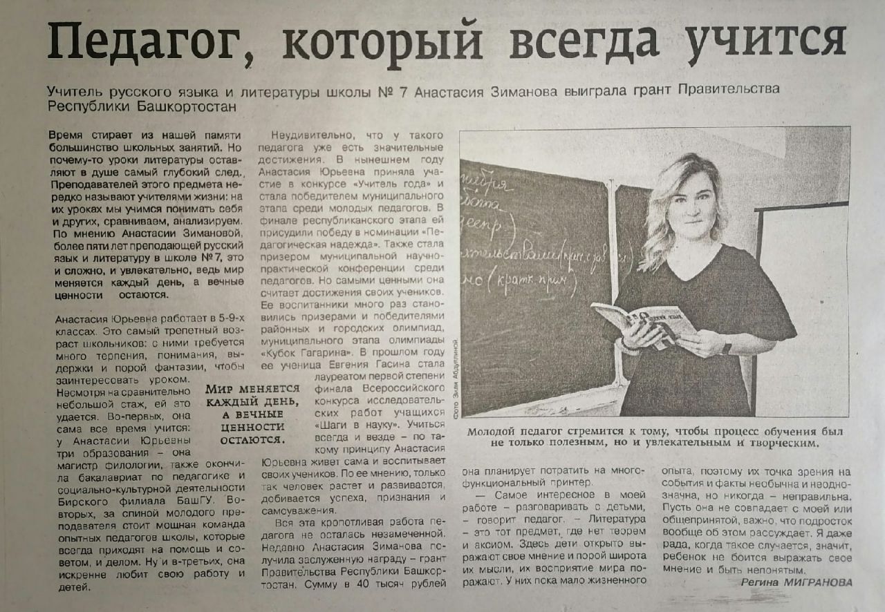 В газете "Туймазинский вестник" опубликована очередная статья об учителе МАОУ СОШ 7 г.Туймазы. Статья посвящена учителю русского языка и литературы Бабкиной Анастасии Юрьевне. Анастасия Юрьевна в этом году стала победителем конкурса на присуждение грантов Главы Республики Башкортостан молодым учителям.