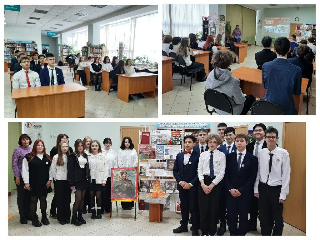 Сегодня в нашей библиотеке для учащихся 9 «Б» класса (классный руководитель Зарипова Р.Ф.) состоялась тематическая программа «Пусть помнят живые, пусть знают потомки», к 80-летию разгрома советскими войсками немецко-фашистских войск в Сталинградской битве. Библиотекарь рассказала ребятам о наступательном и оборонительном периодах самой кровопролитной битвы в истории воин. Учащиеся узнали о подвигах связиста М. Путилова, восстановившего повреждённую линию связи ценой своей жизни, красноармейца М. Паникаха, защищавшего металлургический завод «Красный Октябрь» и снайпера Зайцева В.Г., уничтожившего 225 солдат и офицеров вражеской армии.Также подростки посмотрели видеоролик про оборону «Дома Павлова», который обстреливался фашистами 58 дней и ночей. А видеорепортаж поведал девятиклассникам об ожесточённых боях на Мамаевом кургане и о строительстве мемориального комплекса, увековечившего подвиг героев Сталинградской битвы с главным монументом «Родина-мать зовёт!». Тематическую программу завершили викториной «Дорогами Сталинградской битвы».