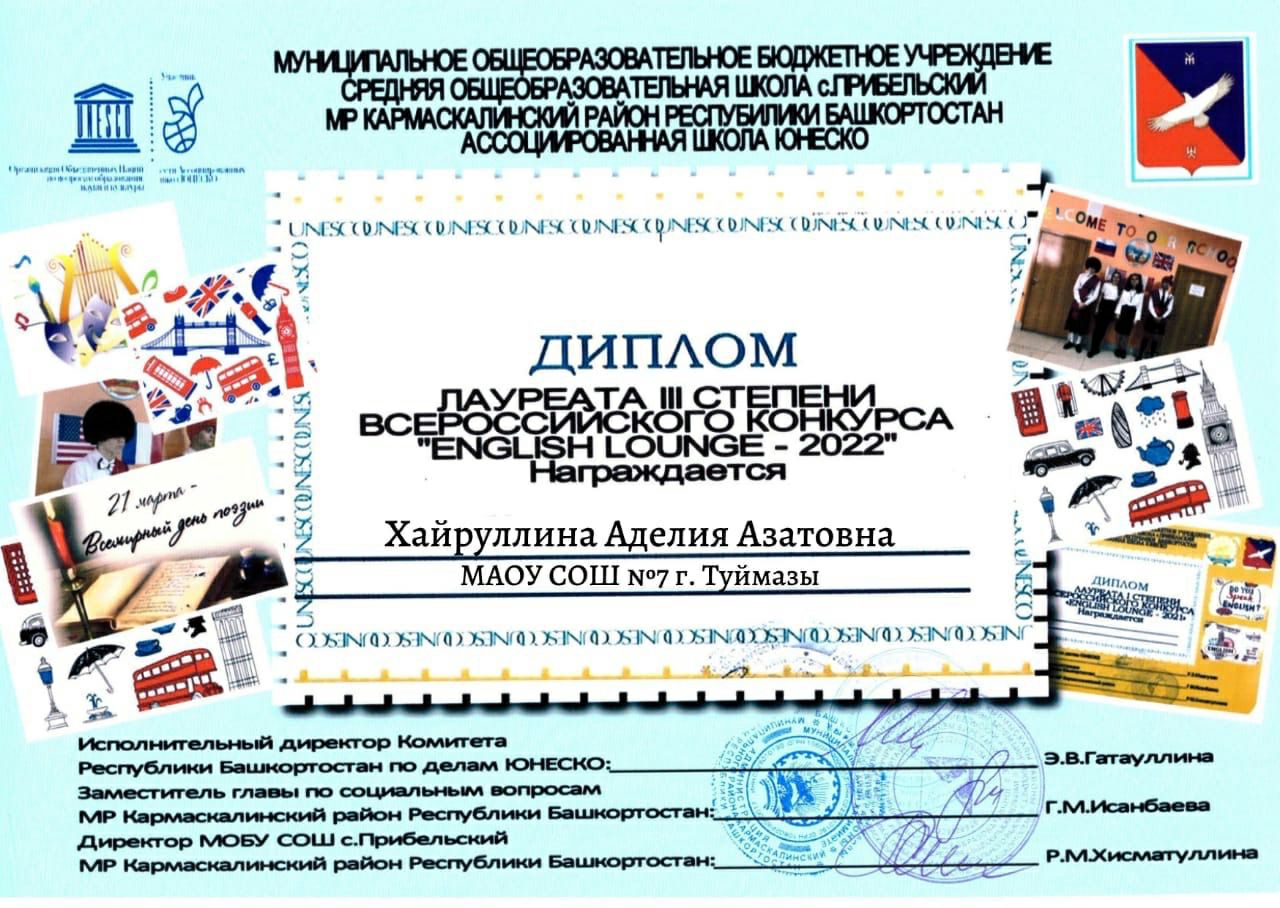 Учащиеся МАОУ СОШ 7 г.Туймазы приняли участие во Всероссийском конкурсе «English lounge-2022” и показали отличные результаты! Шайбекова А. - гран-при, Соловьев Е., Шаехова Р. - диплом 1 степени, Шарифуллин А., Ермошина Т., Шарифуллина Ч. - диплом 2 степени, Хайруллина А. - диплом 3 степени. Поздравляем учащихся с отличным результатом!!!