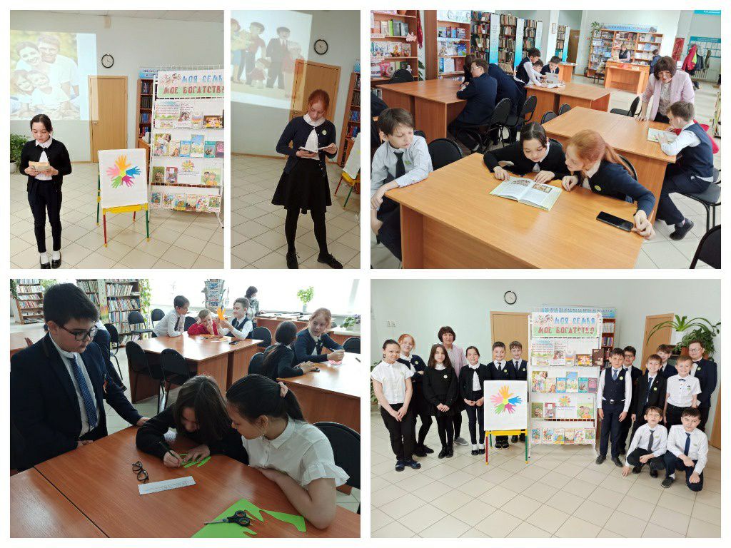 Сегодня в нашей библиотеке для учащихся 4 класса школы №7 состоялась литературно-познавательная программа «Как хорошо, что есть семья», к Международному дню семьи. В ходе групповой работы четвероклассники, пользуясь толковыми словарями В. Даля и С. Ожегова, объяснили значение слова семья. Затем ребята отгадали загадки из книги «1000 загадок», дополнили пословицы о семье и ответили на вопросы викторины «Кто это?». Вырезав ладошки из цветной бумаги, на каждом пальчике написали семейные традиции, любимые занятия и добрые дела своей семьи.