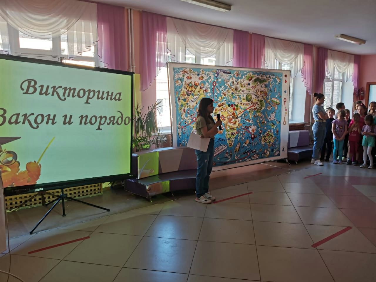 Затем, на территории школы состоялась беседа с инспектором ОДН профилактике правонарушений.Ребята внимательно слушали и даже задавали интересующие их вопросы. Наполнившись знаниями, все отряды отправились на викторину "Закон и порядок", на которой каждый смог проверить знания прав и обязанностей человека, а также освоить некоторые законы при помощи сказок. В конце викторины была музыкальная физминутка и объявление итогов мероприятия.Завершился наш день спортивными эстафетами и подвижными игоами на улице. С радостью ждём нового путешествия на неизведанные острова!!