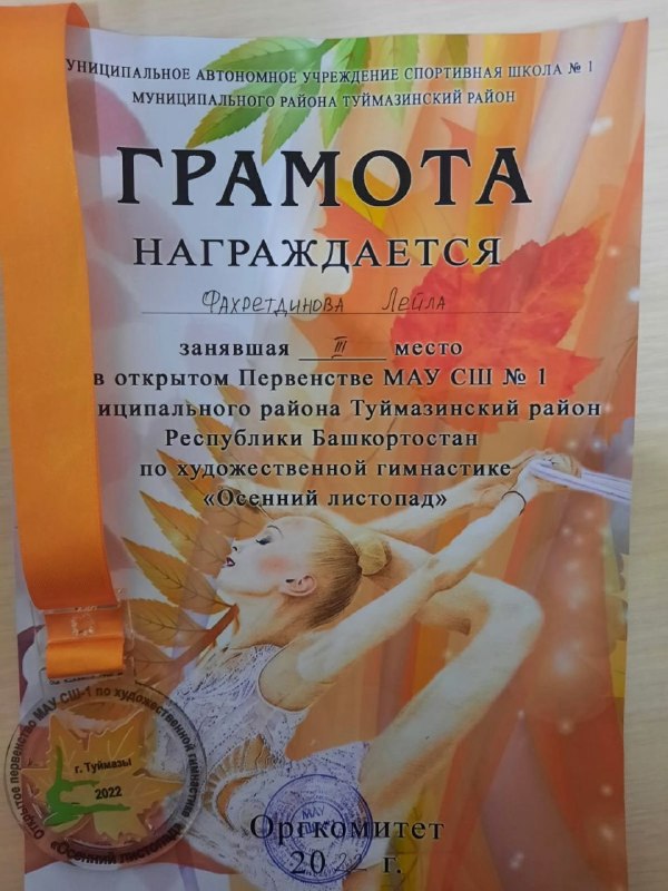 30 октября состоялось Открытое Первенство МАУ СШ №1 муниципального района Туймазинский район Республики Башкортостан по художественной гимнастике "Осенний листопад". Ученица 3д класса МАОУ СОШ №7 стала призёром, заняв
