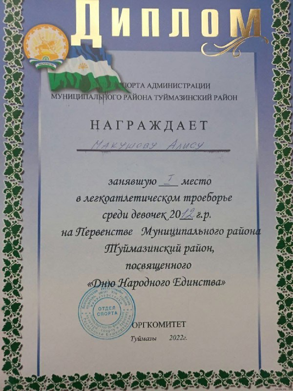 3 ноября в г. Туймазы проходило легкоатлетическое троеборье среди девочек 2012 года рождения на Первенство Муниципального района Туймазинский район, посвященное "Дню Народного Единства". Ученица 4 "Д" класса заняла 1 место