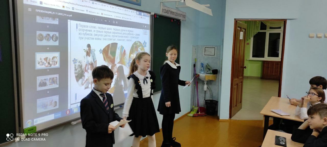 Старшие школьники посмотрели вступительное слово М.А. Львовой-Беловой, Уполномоченного при Президенте Российской Федерации по правам ребёнка, об учреждении праздника День матери в Российской Федерации, выполнили интерактивные задания с пословицами и поговорками, узнали о многодетных семьях России, об учреждении звания «Мать-героиня», медали и ордене «Родительская слава».