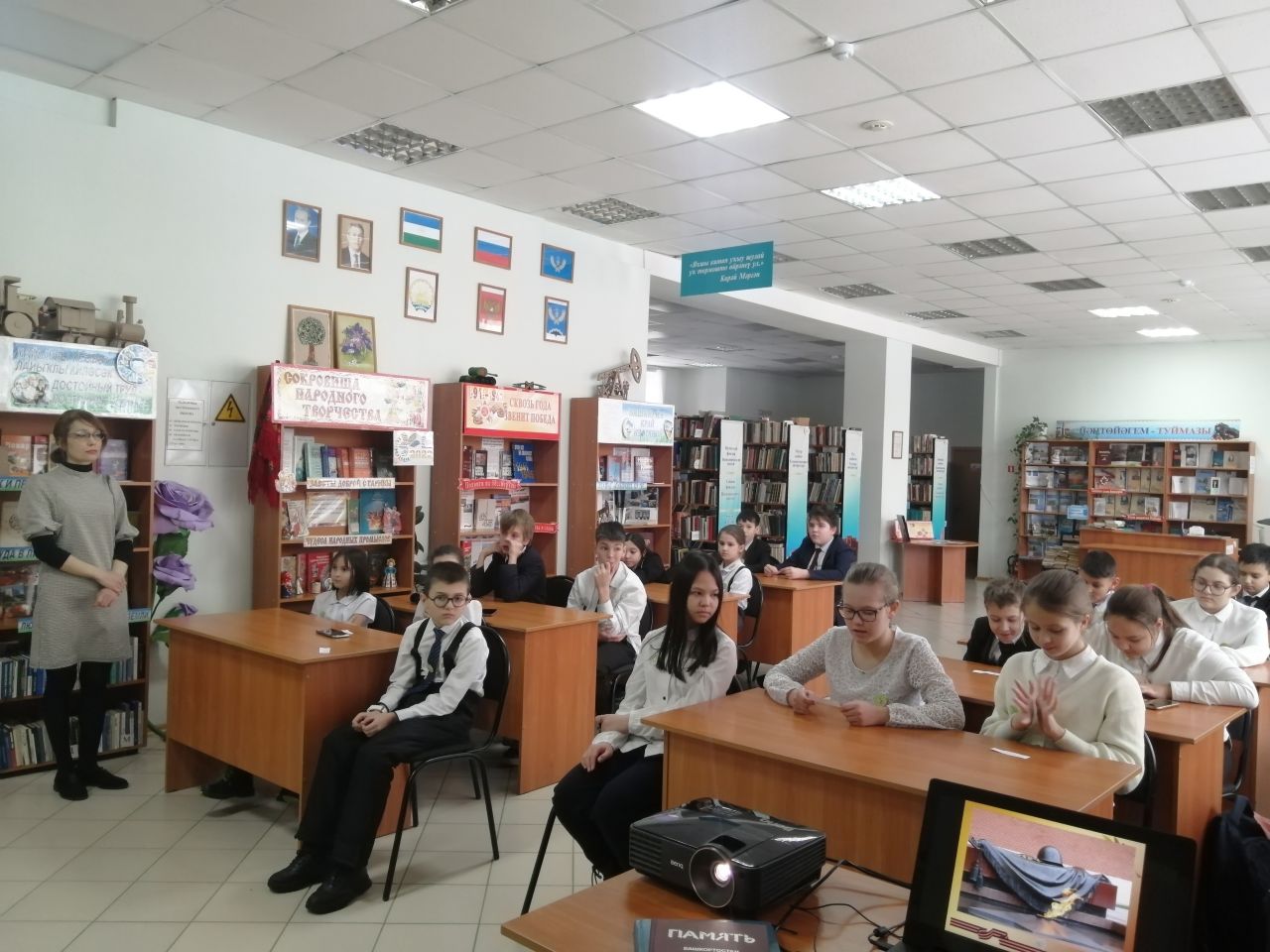 В начале мероприятия школьники послушали отрывок из поэмы Роберта Рождественского «Реквием». Услышали музыкальное произведение В. А. Моцарта «Реквием», которое прозвучало при чтении библиотекарем стихотворения Сергея Орлова «Его зарыли в шар земной…». Далее пятиклассники узнали о памятной дате военной истории России – 3 декабря. Библиотекарь рассказала историю Дня Неизвестного Солдата. По ходу рассказа, проиллюстрированного слайдами электронной презентации, учащиеся посмотрели фрагмент документального фильма 1966 года «Открытие могилы Неизвестного солдата в Москве». Также узнали о Туймазинском районном Поисковом объединений «Народная память о защитниках Отечества имени Султанова Х. А.», руководителем которого является Бирюзов Юрий Леонидович (член Союза журналистов Российской Федерации и Республики Башкортостан»; член Союза писателей РФ и РБ). Познакомились с Книгой Памяти, представленной на тематической книжной выставке «Имя твоё неизвестно».