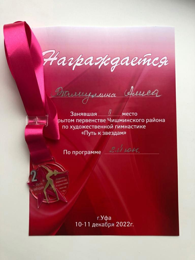 Ученица 1в класса заняла 2 место в Открытом первенстве Чишминского района по художественной гимнастике "Путь к звездам", проходившем 10 декабря 2022г