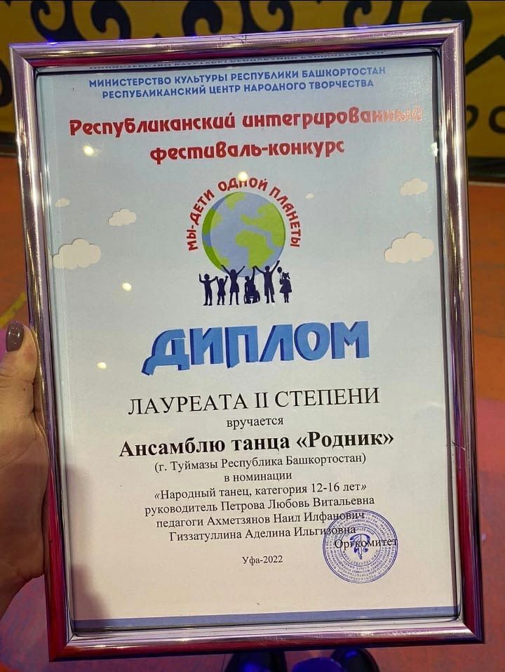 4 декабря в г. Уфа ученица 7г класса с ансамблем танца «Родник» заняли лауреат 2 степени в республиканском интегрированном фестиваль-конкурсе «Мы дети одной планеты» с русским танцем «Туймазинские закрутки» Школа гордится тобой!!!