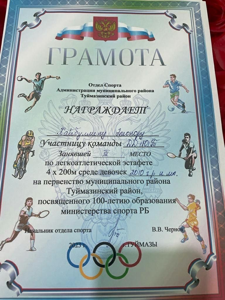 29 января 2023 года прошла легкоатлетическая эстафета на первенство муниципального района Туймазинский район, посвящённого 100- летию образования министерства спорта РБ. Ученица 6 а класса участница команды Ддют, заняла 3 место в эстафете 4x200 м среди девочек 2010 года (и младше) рождения.