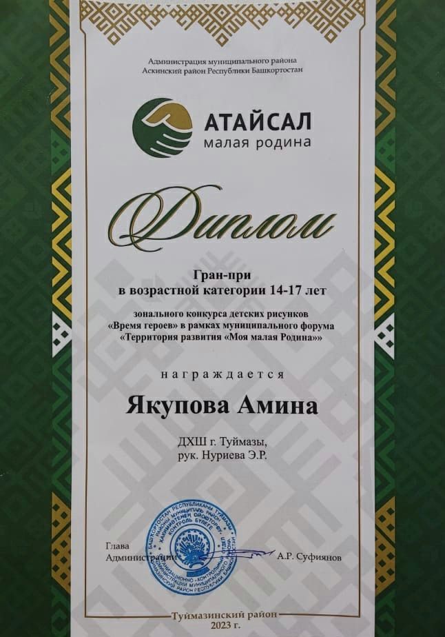 Ученица 7а класса стала обладателем Гран-при зонального конкурса детских рисунков «Время героев» в рамках муниципального форума «Территория развития «Моя малая Родина»».